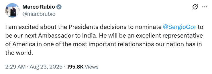 सर्गियो गोर एक अमेरिकी व्यवसायी और राजनीतिक कार्यकर्ता हैं, गोर जन्म से रूसी मूल के व्यक्ति हैं जो बाद में अपनी मां के साथ अमेरिका शिफ्ट हो गए थे।टैरिफ के कारण मची उथल पुथल और विश्व में मची हलचल के बाद जब भारत ने अपने पड़ोसियों से सम्बन्ध सुधारने को देखा जिसके तहत शीघ्र ही चीन और भारत के बीच आवागमन और वस्तुओं के आवाजाही के लिए मार्ग तक की चर्चा होने लगी(Border Trade Open), भारतीय प्रधानमंत्री चीनी दौरे पर जाने को तैयार हुए, तभी अमेरिका द्वारा ऐसी नियुक्ति खासा अहम हो जाती हैं।