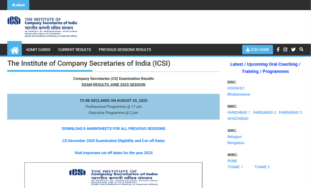 यह परीक्षा के रिसल्ट को 25 अगस्त 2025 को आना तय हुआ था , जैसा कि अपडेट में बताया गया था , अपडेट ही ही अनुसार आपको 2 बजे तक आपका रिजल्ट The Institute Of Company Secretaries Of India इसकी ऑफिशियल वेबसाइट से देखने के प्राप्त होगा जहां पर रिजल्ट के लिंक को एक्टिवेट कर दिया जाएगा जिससे सभी लोग आसानी से आपका रिजल्ट देख और प्राप्त कर सकेंगे।